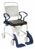 Легкая конструкция из анодированного алюминия не подвергается коррозии. Спинка и сиденье выполнены из высокопрочного пластика. Сиденье оборудовано U-образным вырезом. Подлокотники откидные, оснащены мягкими накладками. Колеса самоориентирующиеся, задние колеса оснащены тормозом. Благодаря складной конструкции стул не занимает много места.